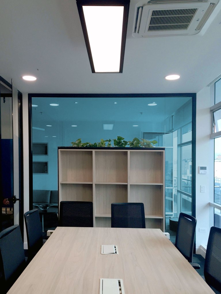 The ceiling was painted blue entirely including installations and cables which gave the space a modern and colourful touch in a subtle way. The main meeting table was in the center of the spacer and acted as eye catcher for clients and visitors.